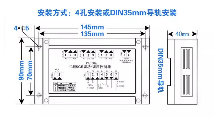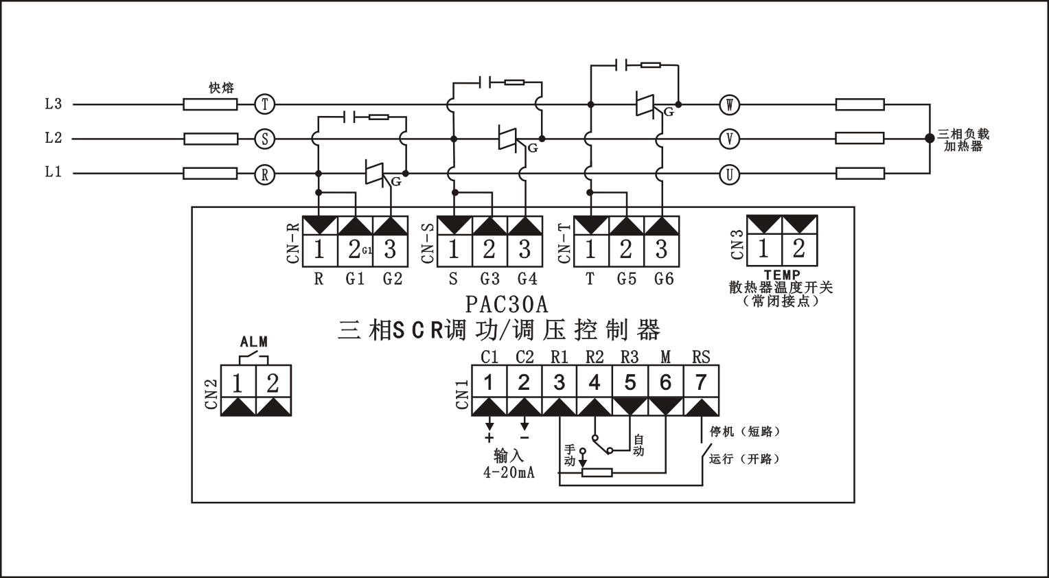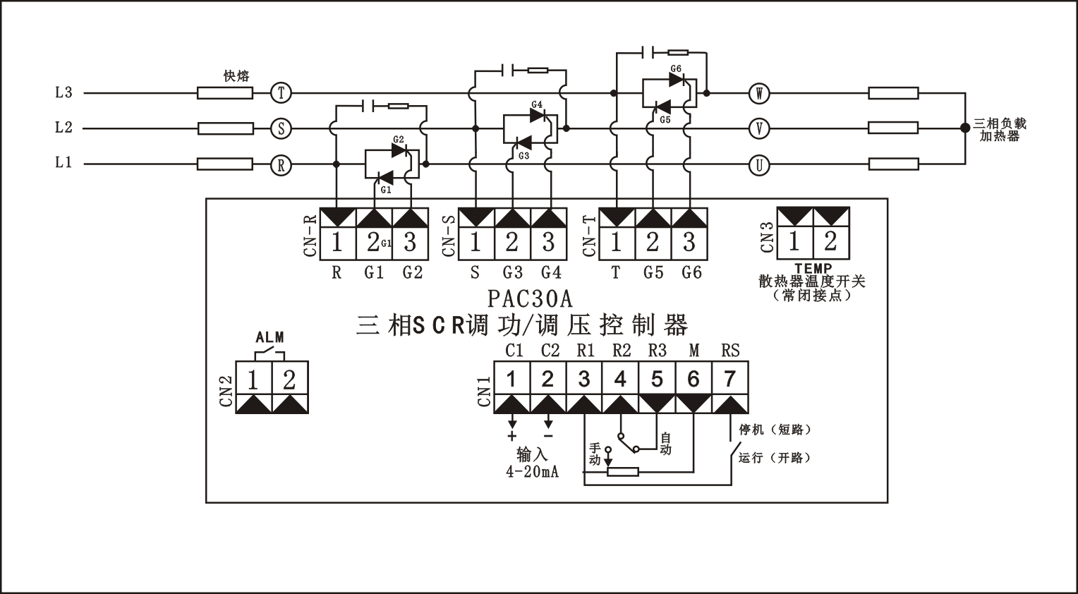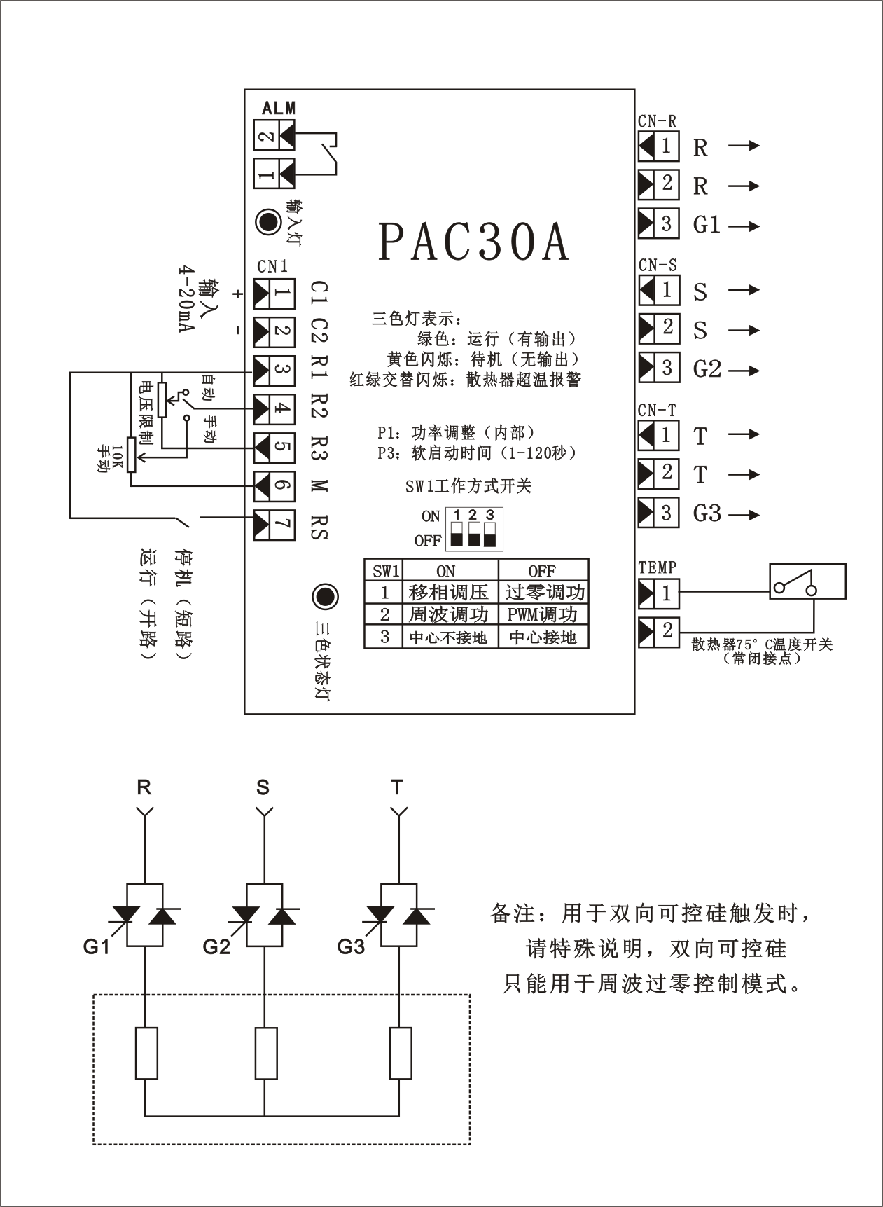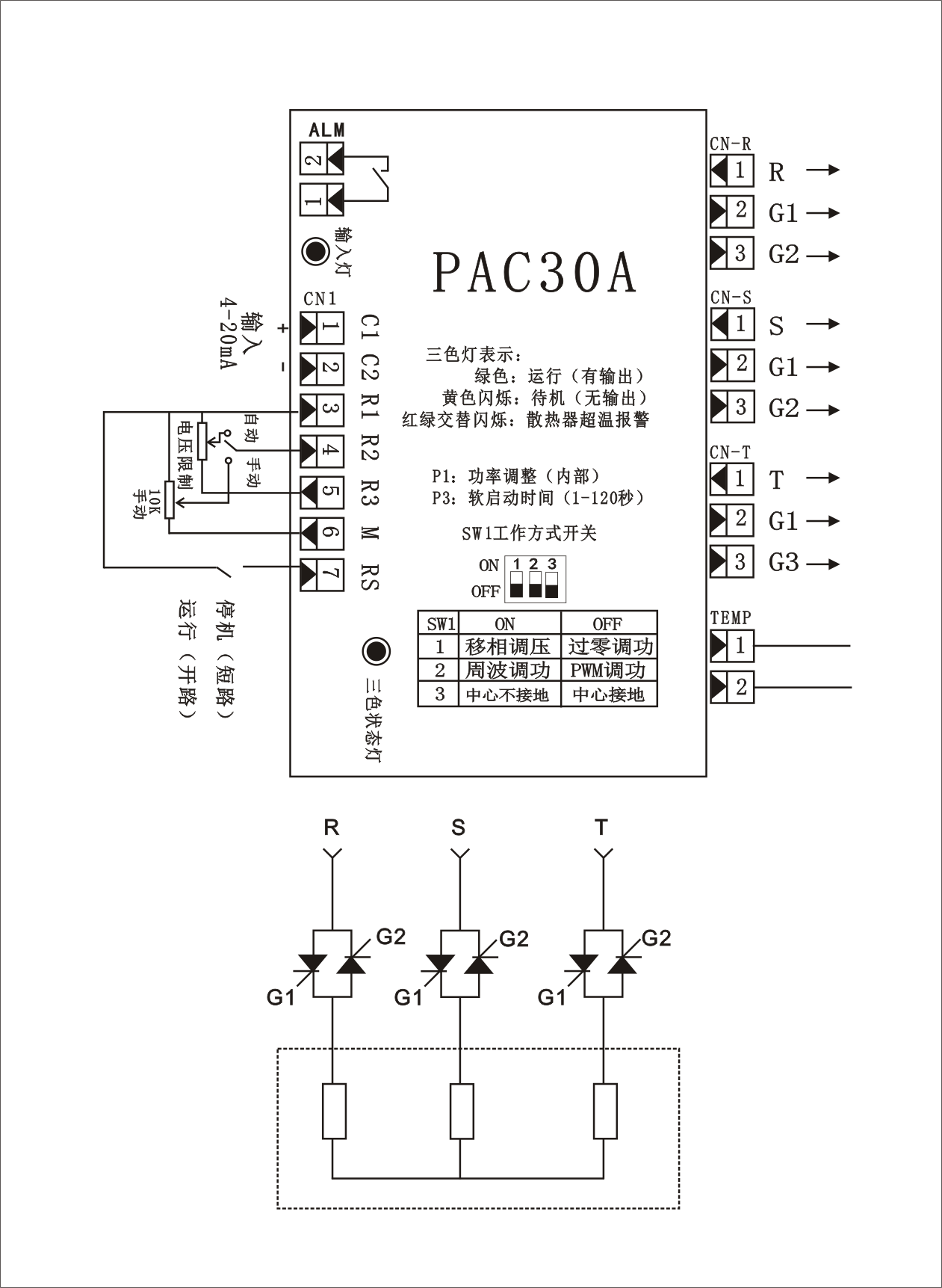 PAC30A三相SCR觸發(fā)器:采用數(shù)字電路智能化設(shè)計(jì),自動(dòng)判相位,接線簡(jiǎn)單,質(zhì)量穩(wěn)定,其主要功能是:調(diào)壓、周波調(diào)功任意設(shè)置,初次上電緩啟動(dòng),手動(dòng)/自動(dòng),輸出限制,超溫報(bào)警等,觸發(fā)雙向可控硅時(shí),需用周波調(diào)功模式。配上阻容吸收器效果更好。
